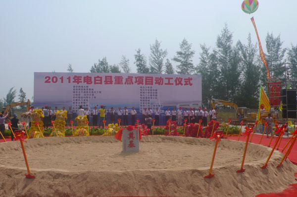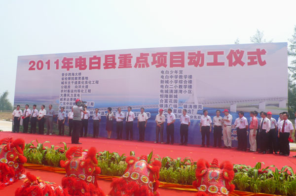 8月30日上午9时正,电白县委县政府在县大会堂举办“电白向前进”的主题大会,包括重点项目推介、签约、动工、剪彩仪式和“发展电白”主题演讲活动。活动由中共县委副书记、县长丁锦文主持。与会嘉宾有:王兆林,许光辉,倪增,蔡端丰,刘敏,除巧文,凌瑞俊,严保伦,梁毅民,吴兆奇,李喜气,林日娣,陈淑芬,刘九权,潘本等。此次活动是共商电白的发展大计,营造“解放思想、争先进位、跨越发展”的良好氛围,加快推进招商引资和项目建设工作建设,将掀起电白新一轮发展热潮。 大会由中共茂名市委常委,电白县委书记李玉楷致词,殷切地寄语滨海新区;中共茂名市委常委,秘书长陈淑芬发表重要讲话。 接着大会举行“发展电白”主题的演讲活动。茂名新洲海产有限公司总经理陈振亮、振兴电白广州联谊会会长李琼兴、中山大学教授倪兆球、第十一届省人大科教文卫委会主任,原茂名市委常委,电白县委书记许光辉作为代表进行演讲。 在一片热烈的掌声中,大会隆重推出的“五区一园”等多个重点建设项目主要涉及经济、社会及民生领域,包括:水东湾中央行政商务区、电白县滨海风情旅游度假区、电白县综合物流区、电白县鼓楼教育园区、电白回归创业园区,水东湾海洋公园。 随后大会进行项目签约,成功签约的项目35个,涉及工业、农业及深加工、旅游业、教育、物流、基建(道路、公共场馆市政建设)、房地产等数十个重大项目,其中有海洋生物科技产业园项目,茂名市海洋生物科技研发中心项目。总投资超百亿,预计投产后年税收可达30亿元,将提供就业岗位20000多个。 大会还为已经竣工的五个项目举行剪彩仪式:具体为新洲水产品项目;茂名市君公农产品工贸有限公司项目;龙头山浪漫海岸酒店项目;电白县海产品专业批发市场项目;霞洞镇正源小学项目。投资总额约15亿元,投产后预计年税收7000万元,可提供就业岗位5000个。 最后,在海景明珠广场为即将动工的项目进行奠基总仪式,顺利完成大会的各项议程。奠基总仪式由电白县委常委常务副县长庞进生主持,县四套班长成员,县法院院长,县检察院长,各镇党委书记,镇长,县副科级以上单位主职领导,重点项目投资建设单位及特邀嘉宾等参加。
