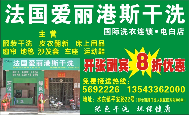 法国爱丽港斯干洗(电白店)开张大酬宾八折优惠,主营:服装干洗,皮衣翻新,床上用品,窗帘,沙发套,车座,运动鞋. 绿色干洗 环保健康! 地址:水东镇平安路22号(即台南路口往人民医院方向200米),免费接送热线:5692226 13543362000