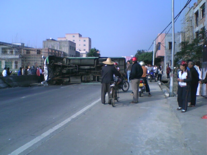 据 传 ,客车是从电城往水东方向开的,司机为了闪避一g横穿的摩托车,撞上公路中间的防护栏,侧翻,有十多人受伤,送医院抢救。据树仔卫生院院长透露,其中多人骨折。大部分患者已转送电城和水东。 9:30时左右,笔者见到客车附近停放有警车和一g消防车,离100米左右还有一辆爆了胎的消防车。 令人人困惑的是,这样重大的交通事故,昨天看新闻,所有省市县媒体都没有报导。
