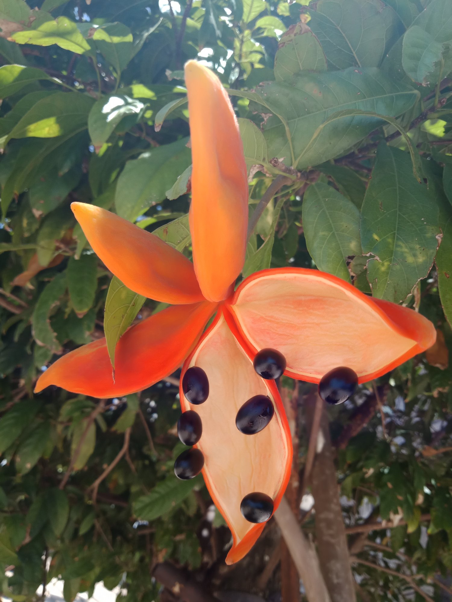 假苹婆(学名:Sterculia lanceolata Cav.):为梧桐科苹婆属常绿小乔木,苹婆会在7月时落叶,有别于秋冬的落叶,可以叫它做换叶树,由于其结果的时间与中国七姐诞辰相近,故称为七姐果、赛苹婆、鸡冠皮等。叶子呈椭圆形,先端急尖,基部钝圆,边全缘,叶柄肿胀。在露地其花期为4-5月份,在温室里3月初就有花。圆锥花序,腋生,密集且多分枝,花淡红色,萼片5枚,仅基部相连,向外开展如星状,其花为单性,雄花的雌雄蕊柄长2-3毫米,向内弯曲,花药大约10个,雌花的子房圆形,花柱弯曲。