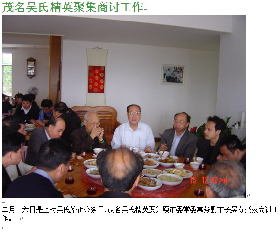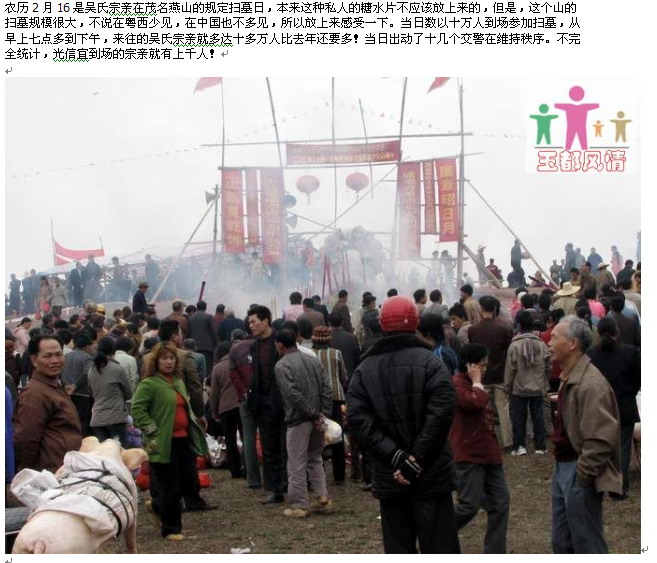 同一个姓氏,同一个祖先.中华吴氏源远流长,是中华发族中的大姓之一.茂名吴氏是中华民族吴氏组成部分,吴氏先贤迁入茂名开基创业近千年来,出现过很多志士仁人,创造了不少光辉的业绩.今天,吴氏后人带着对祖辈的敬仰,一家老小,拖儿带女,千里迢迢回到家乡在老祖宗的坟前烧上一柱香.-----小娴