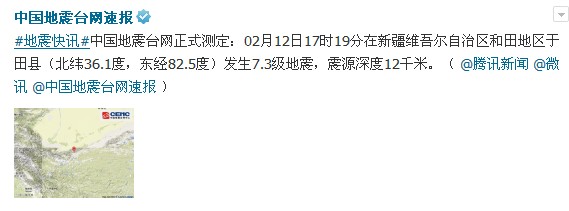 2月12日17时19分在新疆维吾尔自治区和田地区于田县(北纬36.1度,东经82.5度)发生7.3级地震,震源深度12千米。