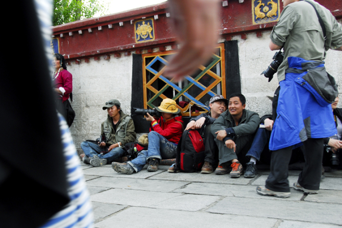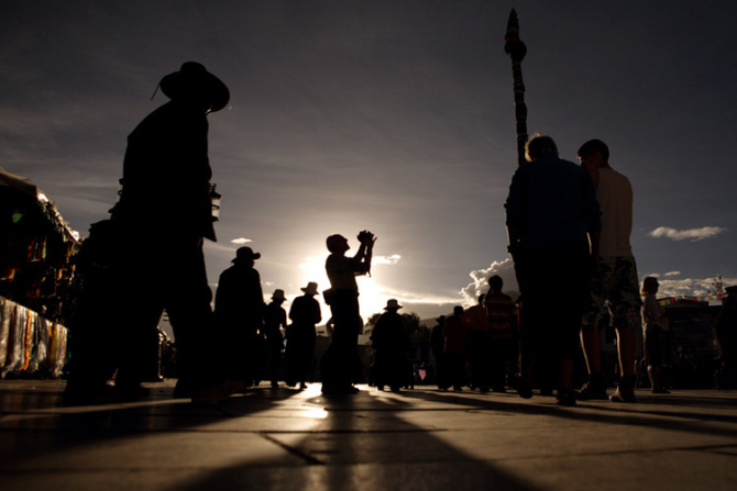 西藏跟内地有二个小时的时差,拉萨几乎晚上八点半天才黑,七点钟的大昭寺四周人头攒动,夕阳毫不柔和的将转经人长长的影子打落在石板路上,无论是叩拜还是行走,每一个小的晃步都会在金色的石板上产生放大的浮动,由视觉神经传导到感知的认识上对藏秘又增加了几分光灵般的神圣