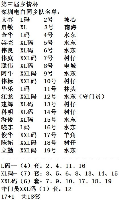 QUOTE(07ken 海江 @ 2010年06月08日 Tuesday, 06:25 PM) 最新消息:初步确定已经有电白老板支持本次比赛的球衣,4个城市,尽快报球员名单和尺寸到广州组委会这里,另外有神秘礼品提供, 特别鸣谢:广东品赢礼品文化有限公司 网址:www.gdpinying.com [snapback]2977929[/snapback] 感谢热心电白老板对家乡足球的支持,特别感谢!