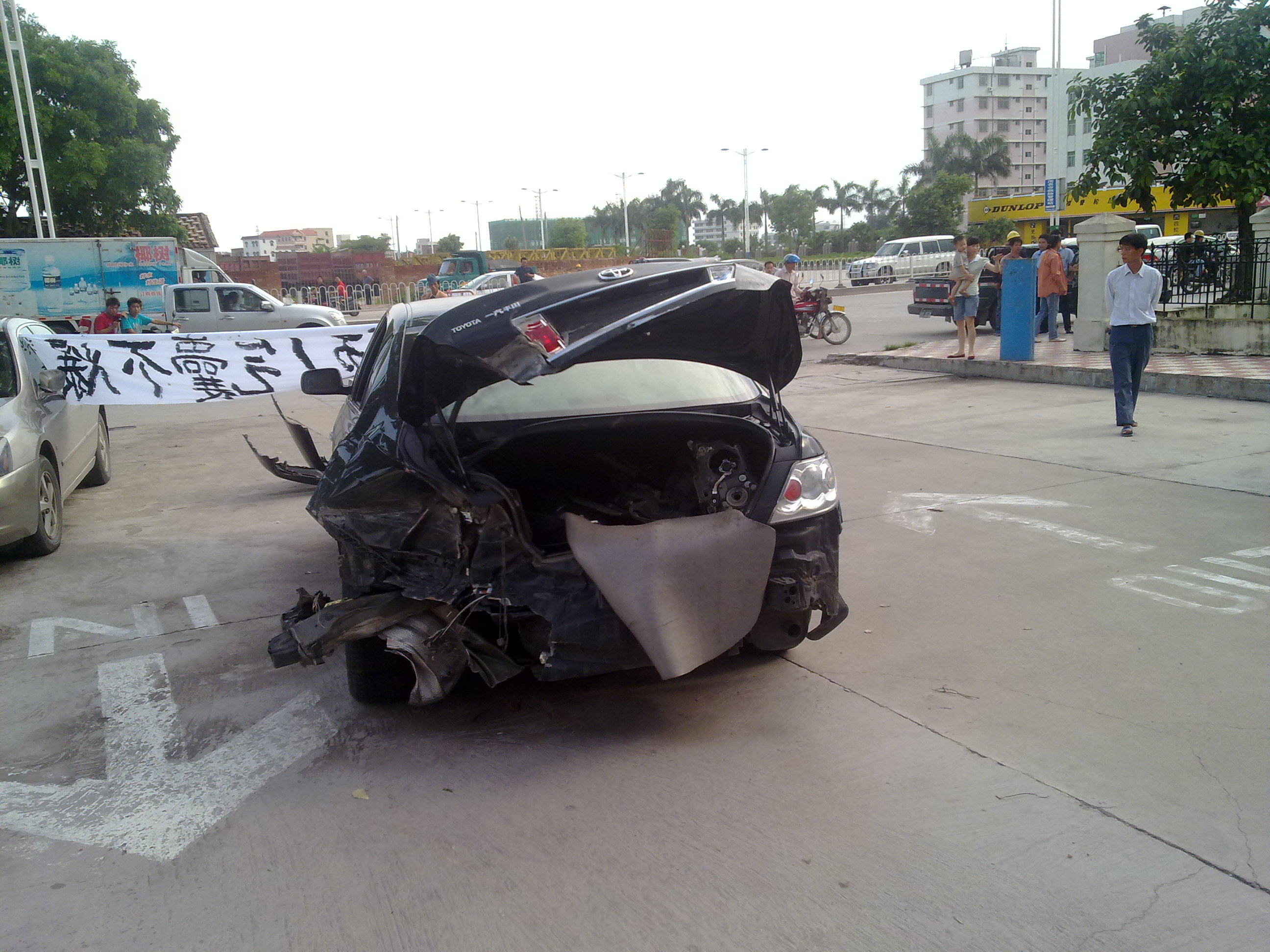 六月十一号车主把车子拉到了茂名一气丰田的销售中心的门口,并拿白布写了一些标语挂在树上和出事的轿车上,引来了大量群众,这时茂名一汽丰田的管理人员找到了车主谈话,说来说去都是在互相推搪责任,说不是质量问题而是车辆撞击力度和速度还没达到爆气囊的要求。当然车主是接受不了这种答复的,而茂名一汽丰田的管理人员也没怎么正视问题。