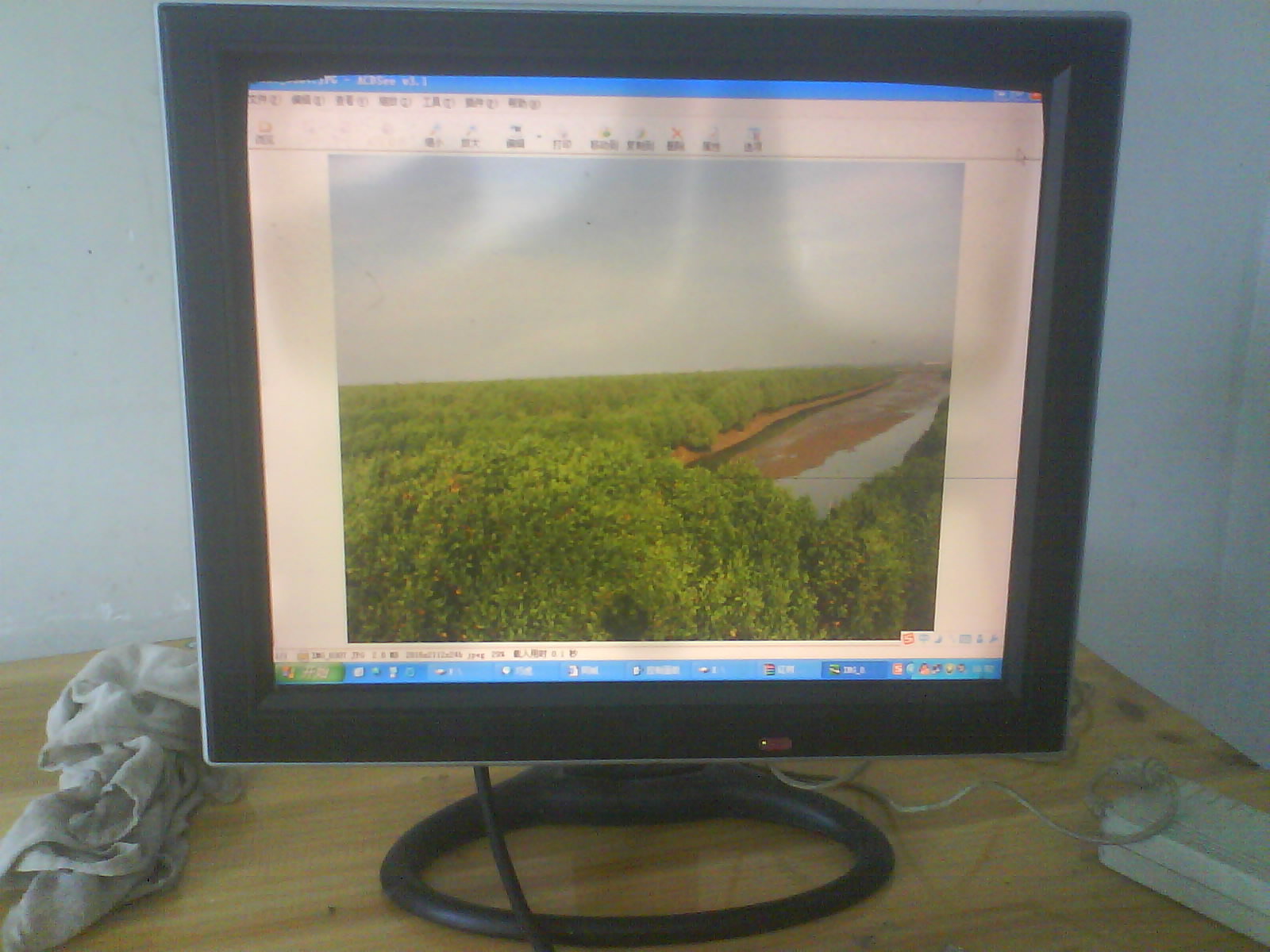 17寸杂牌液晶带一条细线,液晶闲置了一段时间,屏幕上方表面老化,有些地方颜色比较亮白,具体看图,手机照的,不是很清楚,实物会好看点。液晶虽有瑕疵但保证可以正常使用,色彩艳丽,07年买的,没出过问题也没修理过的。