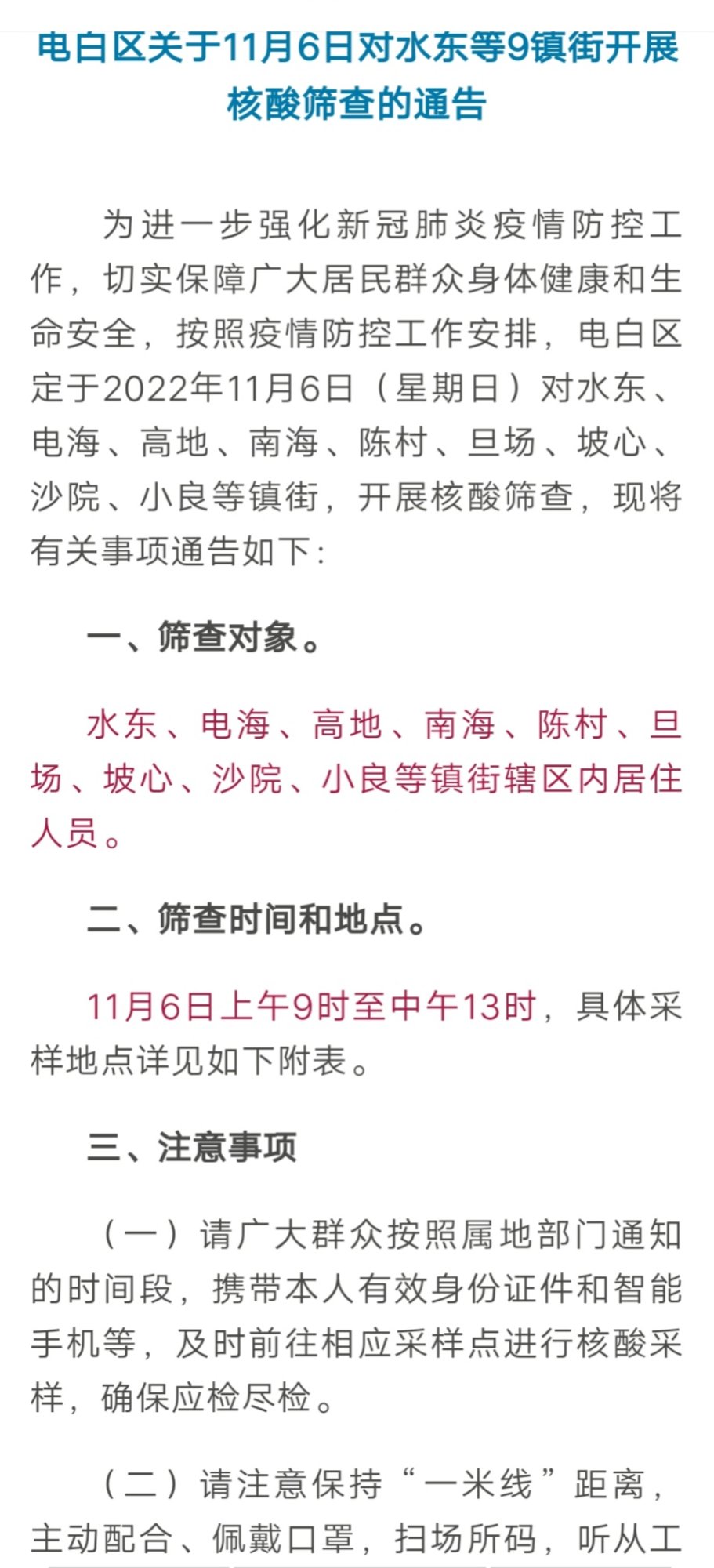 关于11月4日对电白区水东电海陈村街道,旦场镇个别村居委会开展大规模核酸检测的通告