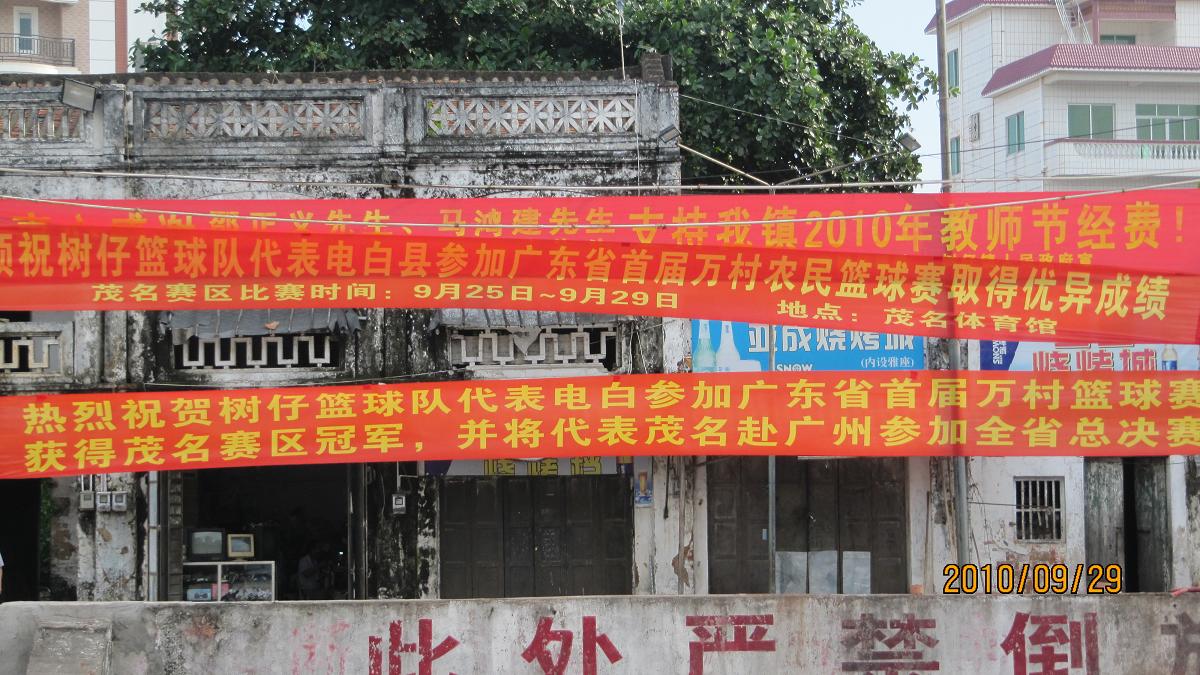 热烈祝贺树仔篮球队代表电白县参加广东省首届万村农民篮球赛,以五战全胜的骄人成绩夺得茂名赛区冠军,并于12月份代表茂名市参加在广州举行的全省总结赛。我们的目标是力争全省冠军,为茂名争光,为家乡赢得更高的荣誉!