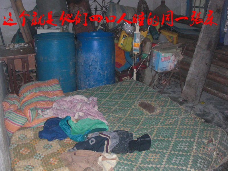 我们问他们是否也是住在这里的时候,彩霞父亲告诉我们说,他们的这里的家已经不能居住了,房子随时有倒塌的危险,除了让她妈妈在这里住,他带着孩子仨个在好心邻居家里借住;我们来到邻居家里的时候,看到是在一间满是杂物的房子里,有着一张下面是木板和箱搭建起来的床,这里就是现在睡着她们的一家四口人,她们说这里晚上除了蚊子比较多,还算是有个地方可以住着;他们的要求如此简单平凡,有瓦遮头经已很满足,对邻居的善心收留亦很是感恩。