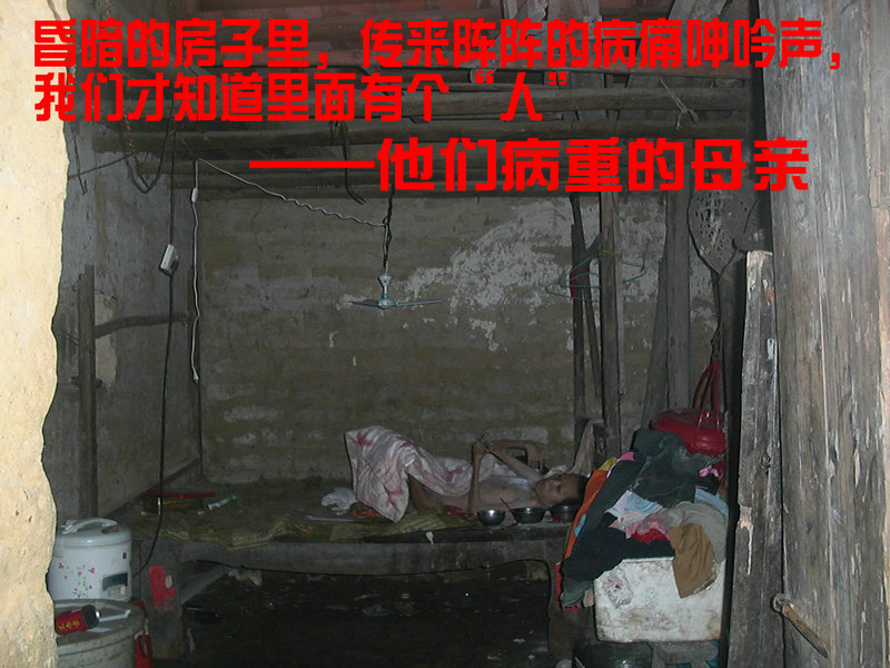 当我们来到她家的时候,我不敢去相信,这就是一个“家”;这是一间已经摇摇欲坠的,倒塌了一半的泥土墩房子里,走进一看,在白天里也是漆黑一片,在借着闪光灯的略过的光线,还有病痛的呻吟声 ,我们才能隐约判断到里面有个人躺在一张床上,而这人就是彩霞的母亲,她在生完最小的弟弟后就一直瘫痪在床,九年了,现在已经是神智不清了,因为生活的穷困,严父在把家里所有钱都投入到给她母亲看病,而现在,面对如此境况,除了让她躺在床上延口残喘,等待最后的时刻到来,也没有其它的路可以让她选择了。