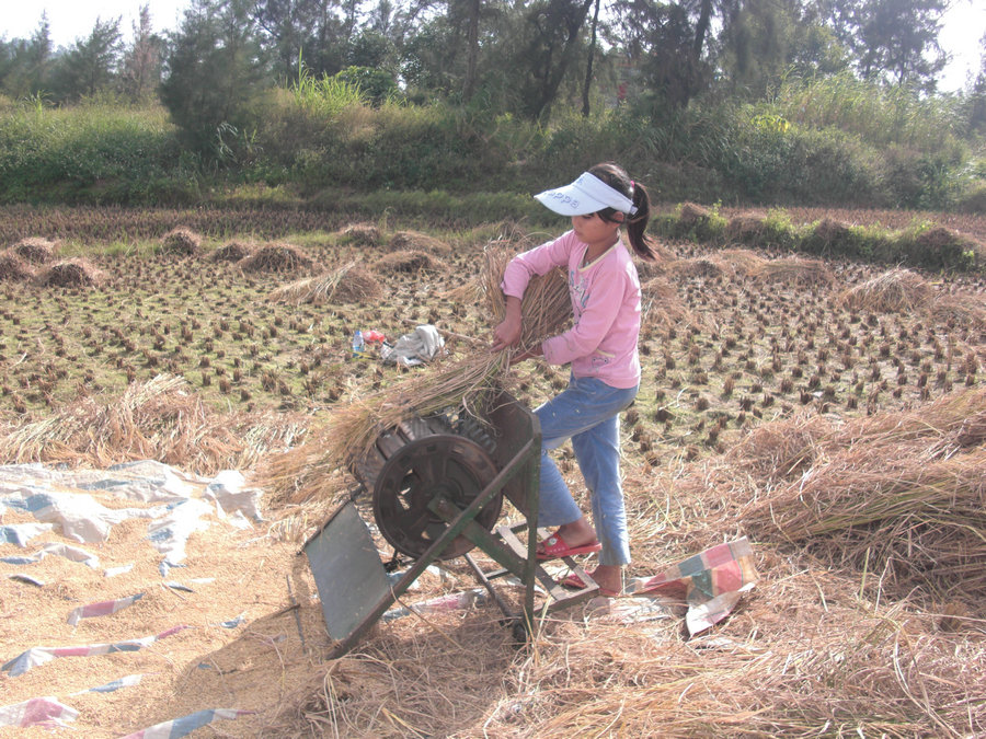 这天,我们在探望完严明珍孤儿后,来到严彩霞的家里,邻居告诉我们,她到田里割禾了!