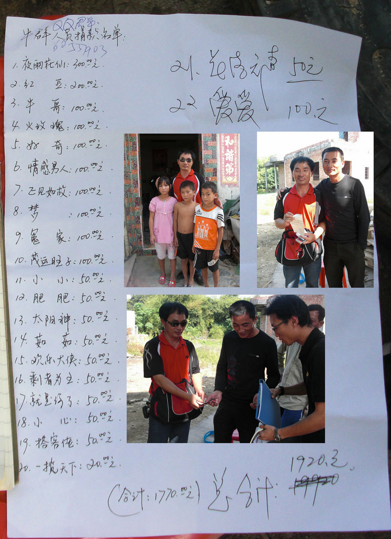 10月23日,爱心人士良哥、海哥从阳江赶赴电城与我们会合,并送上700元的慰问金。联同茂名与阳江两地的爱心网友、"同城朋友群"、"牛群"两大QQ群的爱心代表探望严彩霞一家,并送上3570元慰问金及助学款