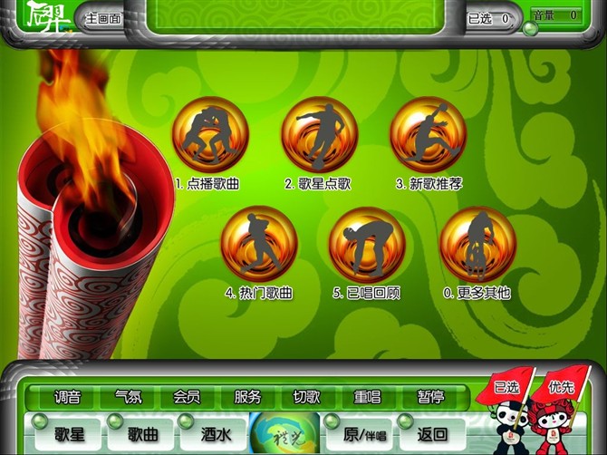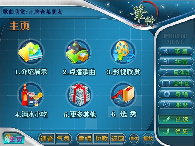 3,全套专业礼光点歌软件,和KTV厅一模一样,原唱伴唱切换,点歌切歌,拼音歌星点歌,等等等等,完