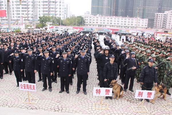 为贯彻落实茂名市委、市政府的部署,打造平安电白、幸福电白,3月14日上午,电白县“打黑除恶”专项斗争誓师大会隆重举行。党政干部方队、公安民警方队、武警官兵方队、群防群治方队等27个方队共2000多名代表庄严宣誓:向黑恶势力宣战,斗争到底,以舍我其谁的担当精神,坚决维护电白社会稳定!
