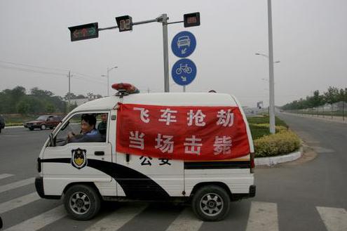 2007年5月30日,郑州中原西路郑州与荥阳交界处,荥阳市公安局豫龙镇派出所民警持枪值勤,在警车上挂起“飞车抢劫当场击毙”红色条幅震慑不法分子/