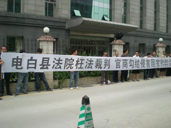 2010年5月12日,博美管区失去耕地无生活来源的部分农民和刘伟峰等人,在电白.和茂名地区投诉无门的情况下,被迫一行近百人拉起横幅:“电白县法院枉法裁判.官商勾结. 侵害国家和群众利益”到广东省人民检察院集体上访(见下图)得到接访。