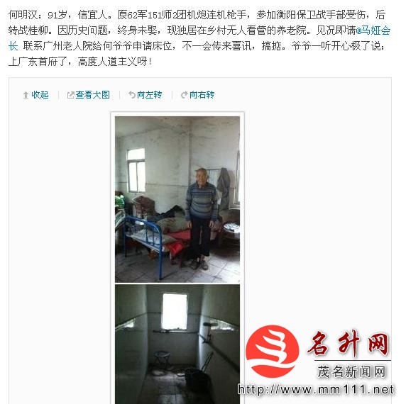 @凌乱是佳人 : 老爷子问何明汉老人是否愿意搬去广州,他一口答应了,几十年一个人生活,他太希望能有人照顾他了。老爷子马上联系@马娅会长 ,不一会儿就搞定床位了,老爷子把好消息告诉老人,老人非常高兴:那就好咯!能去广东省府生活,我晚年就有福了!@行者孙冕 @关爱老兵网@深圳老酒 @关爱抗战老兵广东群