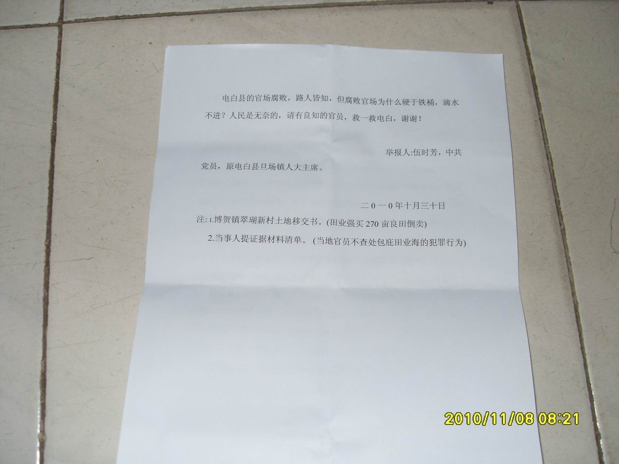 举报人:伍时芳 (中共党员、原电白县旦场镇人大主席) 手机:13642410631电话:06685829570