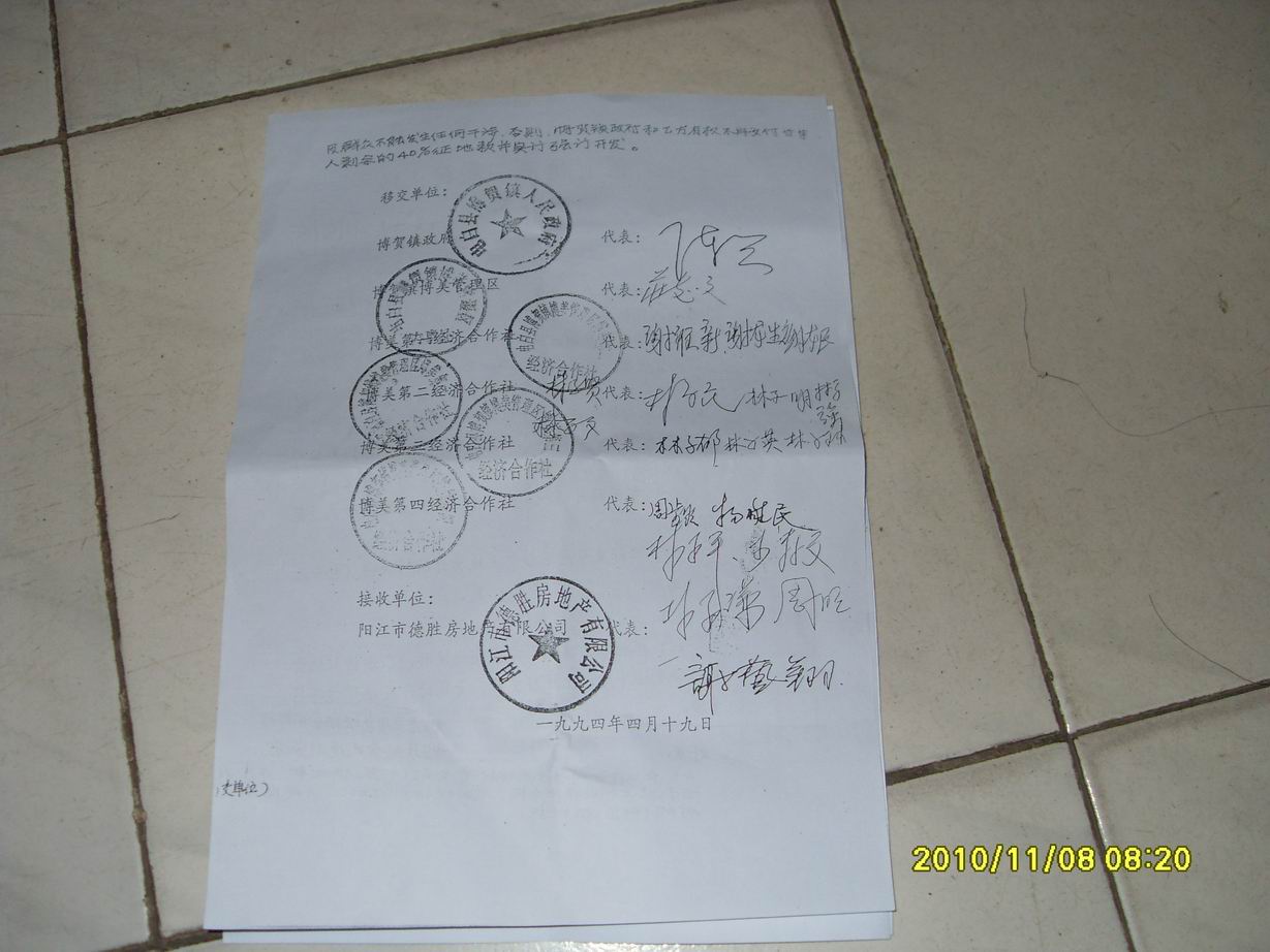 陈付、陈伟隆林江、刘伟锋、伍时芳、邓冠平等100位中国公民,怀着万分悲伤又十分无奈的心情向你举报:电白县财政局长田业海倒卖博美270亩集体土地,而电白县人民法院院长充当帮凶的犯罪事实。田业海一个屠夫,一九九三年结识时任电白县书记杨光亮,二人臭味相投,经过密谋后,以田业海这个亡命之徒出面,指使阳江市华阳集团公司经理黄宜胜(田业海母舅)成立子公司(阳江市德胜房地产有限公司),以与博贺镇政府联营开发翠湖新区为幌子,强行征收博美管区第一、二、三、四经济合作社良田270亩,杨光亮、田业海在一九九六年得到土地后,立即吊销阳江市德胜房地产有限公司,田业海即伪造该公司印章,假冒该公司法定代表人疯狂进行非法倒卖土地,杨光亮、田业海倒卖270亩土地的涉案金额324000000元(按每平方米2000元计算),国家损失税费64800000元(按总额20%计算),270亩特别巨大的土地被倒卖,但至今未一分一厘向国家报批,国土部门也从未查处。