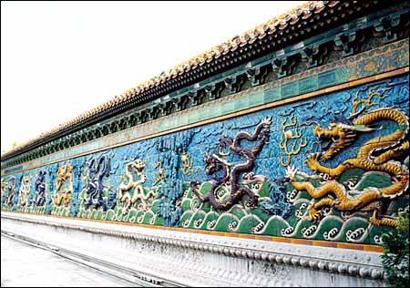 九龙壁的正面共由270块烧制的琉璃塑块拼接而成,照壁饰有九条巨龙,各戏一颗宝珠;背景是山石、云气和海水。编辑本段图形 九龙壁上面的九龙,形体有正龙、升龙、降龙之分,每条龙都翻腾自如,神态各异。为了突出龙的形象,工匠们采取浮雕技术塑造烧制,富有立体感;并采用亮丽的黄、蓝、白、紫等颜色;使得九龙壁的雕塑极其精致,色彩甚为华美。有关专家认为,故宫九龙壁之所以看起来活灵活现,是因为工匠们在配制色调的时候,采用了色彩补偿的原理,十分令人赞叹。编辑本段巧补故宫九龙壁 在故宫皇极门的南侧,有一座建于清朝乾隆年间的九龙壁,设计精巧,造型独特。壁上的九条龙神姿各异,腾跃于祥云之中,鳞光闪烁,栩栩如生。如果您仔细查看,会发现从东边数第三条白龙的身上的一块琉璃瓦与众不同,原来它是后补上去的。编辑本段工匠马德春与故宫九龙壁 这建九龙壁可不是一般的工程,讲究多、难度大。必须要找那些技艺高超的人才行。工部大臣选来选去,最后选中了一个叫马德春的工匠。这马德春烧制琉璃瓦十几年了,技术高超。他选几十位工匠,第三天就开工了。干活前,他向工匠们讲了烧制彩色琉璃瓦的要求。他说:“那烧制彩色琉璃瓦对材料的配比和火候的掌握,非常讲究,要是掌握不好分寸,烧制一件琉璃成品,就得有十来件废品作为代价。大伙要多留心,千万别出差错。”说完就带着大伙儿干了起来。他们费了九牛二虎之力,足足烧了七七四十九天,总算烧制成了。 安装这天,皇极殿门前人来人往,工匠们有条不紊地忙碌着。突然一声清脆的响声传来,吓了马德春一跳。他来到出事地点一看,一个小工匠呆呆地站在那儿,直勾勾地盯着摔碎的一片琉璃瓦。马德春小心翼翼地把碎琉璃瓦片拼凑在一起,仔细地看了看,低声对周围的工匠说:“这事儿对任何人都不能讲,谁要是吐露一个字,可有杀身之祸啊!” 在回家的路上,马德春的心是七上八下,他想重新烧制那片琉璃瓦是来不及了,延误工期的罪名担当不起,可是另打主意来补救又要冒着欺君之罪的大险呀!眼看没几天就是交工期了,他把心一横,等死不如闯一闯。到家后,他茶不思饭不想,不管谁来也不见,一个人来到小仓房,把门窗挡严,悄悄地自制“琉璃瓦”。 九龙壁完工的消息,及时上奏了皇帝。第二天乾隆就带着几位大臣前往观看,刚一进锡庆门就赫然看到那座金碧辉煌的九龙壁。走近再一细看,那九条龙栩栩如生,就和真的差不多。乾隆皇帝顿觉满目生辉,不住赞叹。他走到壁前,仔细欣赏每一片琉璃瓦上的巨龙,从东到西,一条龙一条龙地观看。跟在人群后面的马德春心都快提到嗓子眼了,头上冒着汗,腿有些发软。那乾隆来回看了三遍,真是从心里喜欢,连连称赞马德春的手艺高超,并重赏了他五百两银子。送走了乾隆皇上,马德春那颗悬着的心才算落了下来。要问马德春为什么提着心呀,那是因为他移花接木巧补了九龙壁。 原来为了补上小工匠摔碎的那片琉璃瓦,马德春费尽了心机。他用了两天两夜的工夫,硬是用一块上好的楠木雕成了一条龙,并在乾隆带着王公大臣前往观看的头一天才匆匆忙忙地安装上,这要是让皇上知道了,就是欺君之罪呀! 而今你若有机会游览,来到九龙壁前,从东边数第三条白龙的身上有一块琉璃瓦就是当年马德春用楠木雕成的,您不妨仔细地瞧一瞧。