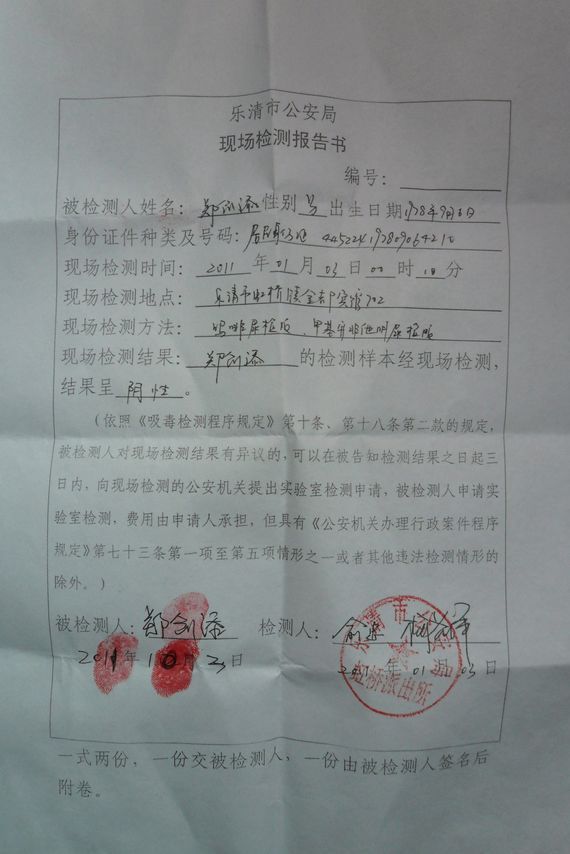 据郑创添向本工作室介绍,今天凌晨,乐清市虹桥派出所等一批警察突然闯入他所在的虹桥金都宾馆内,要求强制对其进行验毒。尽管郑创添据理力争,要求警方解释行为依据,但最终被强制在宾馆内验毒。验毒结果最后被确定为阴性,没有吸毒。郑创添此前还说,他们入住金都宾馆后,乐清市国保也住了进来,并且就住在他们房间对面。白天出门时,国保则紧紧跟随。