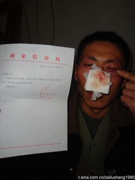 @记者陈宝成:【国家信访局一张纸,几废他一只眼】1月4日,山东青岛平度香店办事处大泥河头村刘富聚(电话13061387558),持国家信访局复函到村委询问,该村卖约1000亩基本农田和耕地,村民没见到一分钱;却被村书记狂殴,致一眼近失明。青岛山大医院初诊为泪小腺断裂。刘近日举报该事,未料这张纸几乎废他一只眼。[attachmentid=253455]