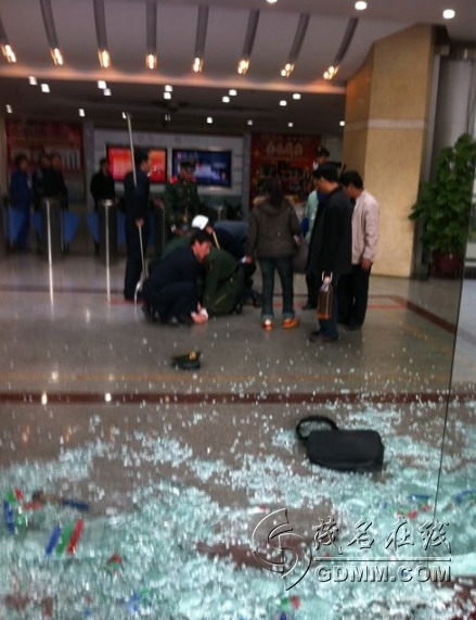 1月19日下午4时15分左右,广东台不知道招谁惹谁了,一中年男子拿着铁锤把玻璃门敲碎了,已被武警制伏!