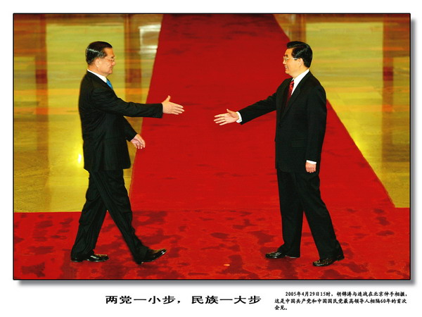 空客380 初中二年级 注册 2009-11-03 消息 469 反馈评分 0 点数 0 2011-01-24 #49 2005年4月29日15时06分,中共中央总书记胡主席和中国国民党主席连战在北京大会堂见面。60年来敌对两党最高领导人的第一次会见,为缓和海峡两岸局势,和平解决台湾问题打下了基础。 附件 19705393_27630666.jpg 80.3 KB · 查看: 412