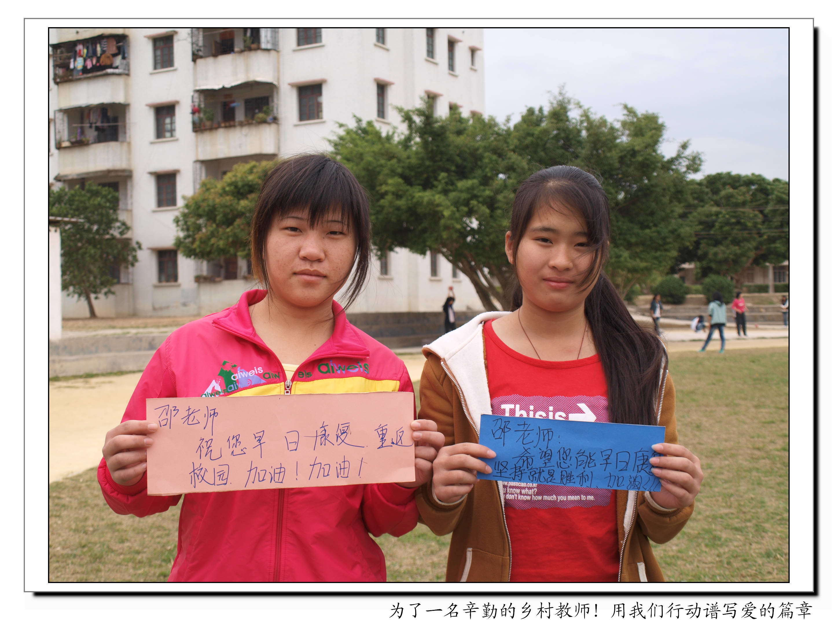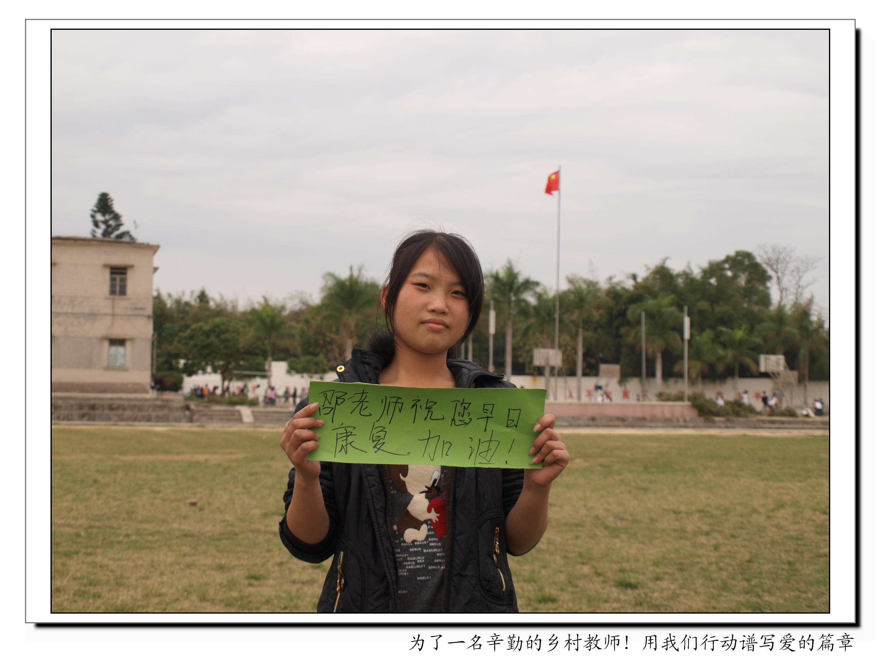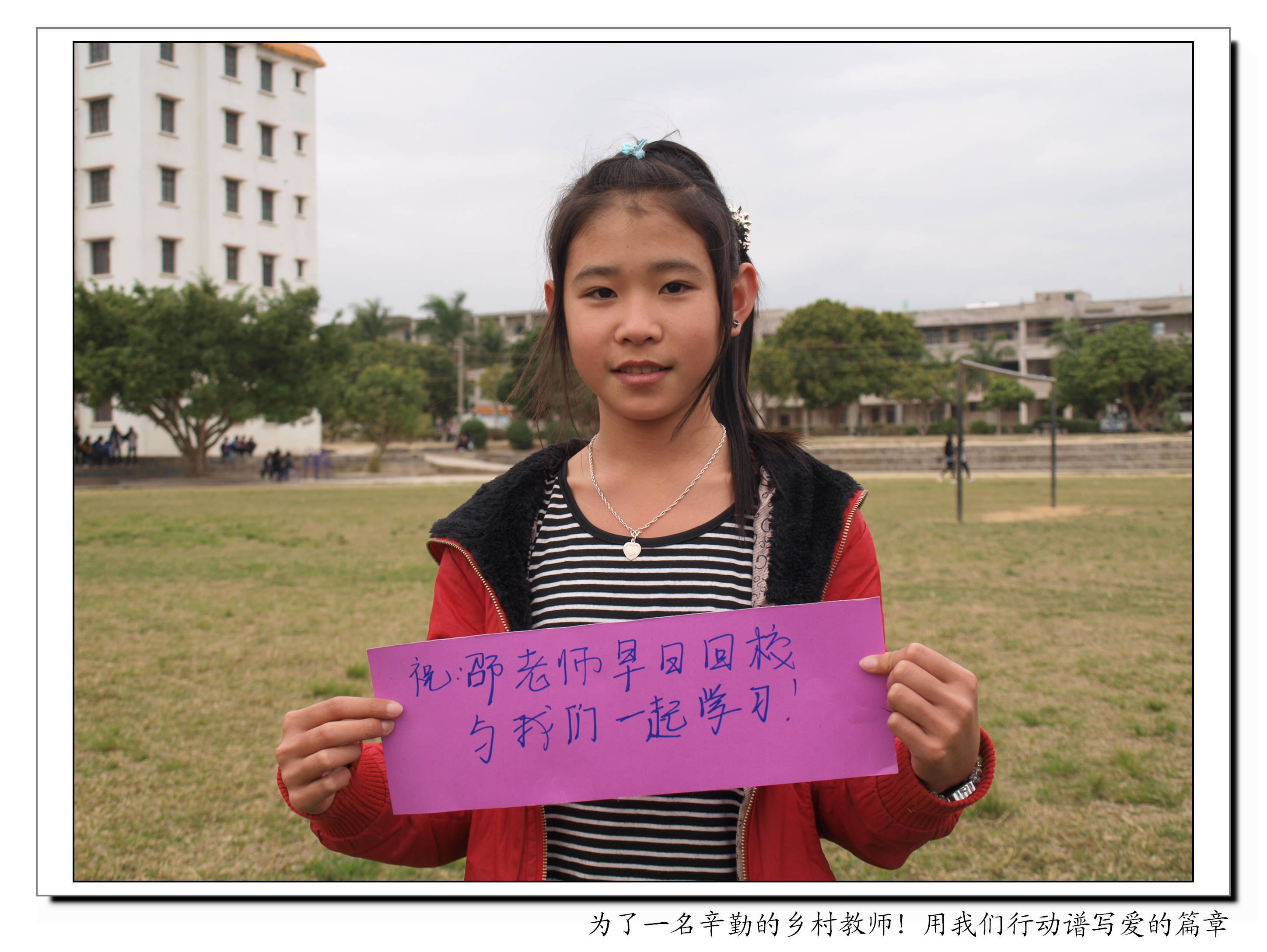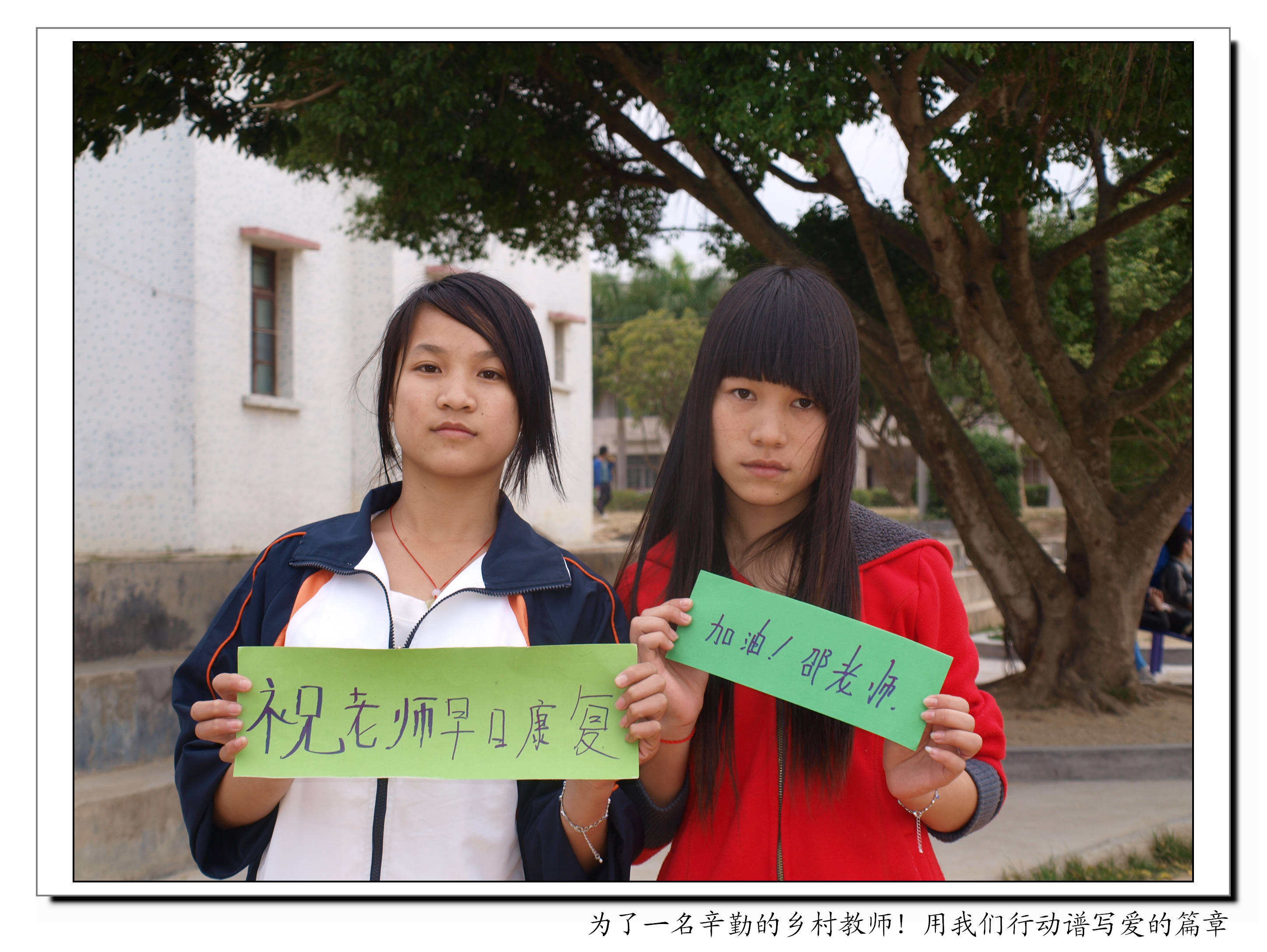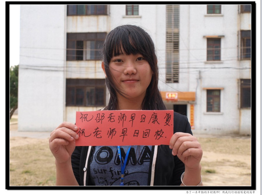 QUOTE(游侠918 @ 2011年03月06日 Sunday, 10:15 AM) 祝邵老师早日康复。好老师人助神佑。 图片上写的字好像同一人手笔,且那些学生表情有点…… [snapback]3108737[/snapback] 卡片上的字都是我写的,卡纸也是自己做的,由于当时有这个让学生拿着祝福语的拍照的想法,所以急着自己做了些,星期五那天自己就带着学生去拍了几张。要说明的是,祈福不是学生自发的,但看到老师这样做的时候,他们也非常踊跃。现在校长获悉了,准备下个星期让团委组织学生一起开展这项爱心活动,我相信不管这个活动形式如何,大家都是很支持的! 还有关于学生拍照的时候的表情,很多同事说跟楼上的一样!可是我觉得支持邵老师,为他打气我们就不要太悲,因为照片的祝福语都是送给邵老师一个人的,让他看到曾经在学校看到那些灿烂可爱的面孔,他会更坚强起来。当然,照片传到论坛上,网友们也会看到会做出各种猜想,不过我觉得孩子的真心的善意超乎了所有不必要的疑虑!
