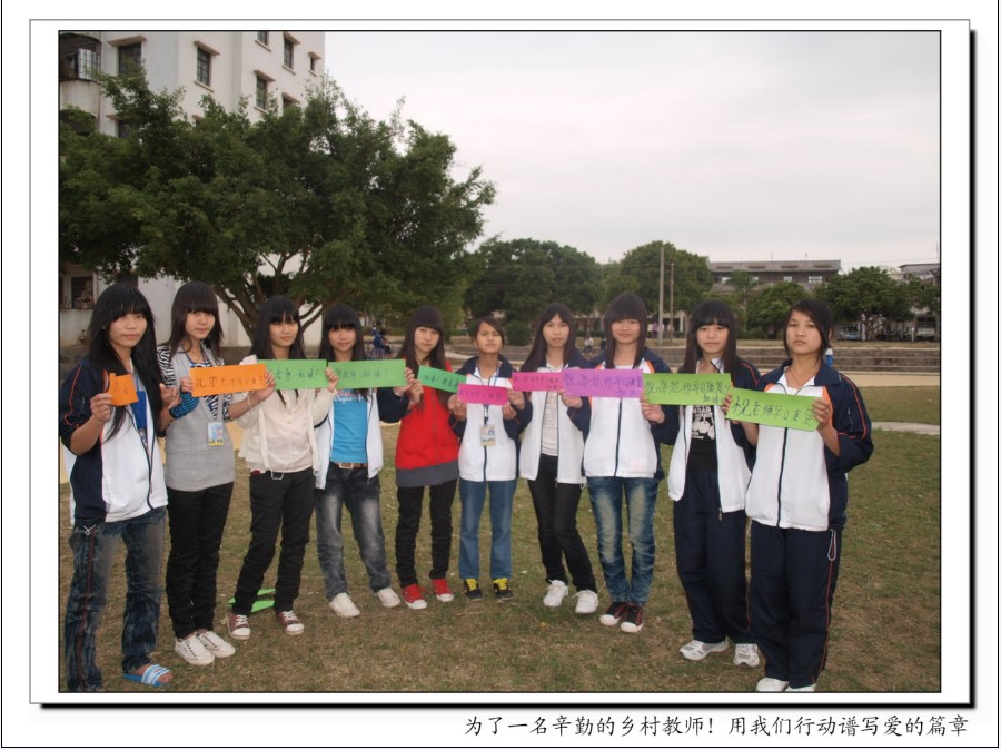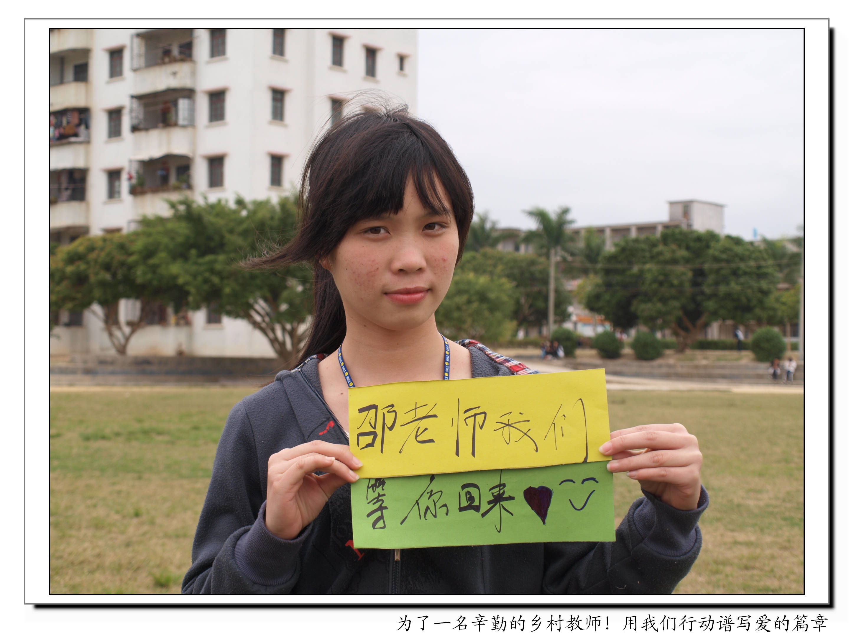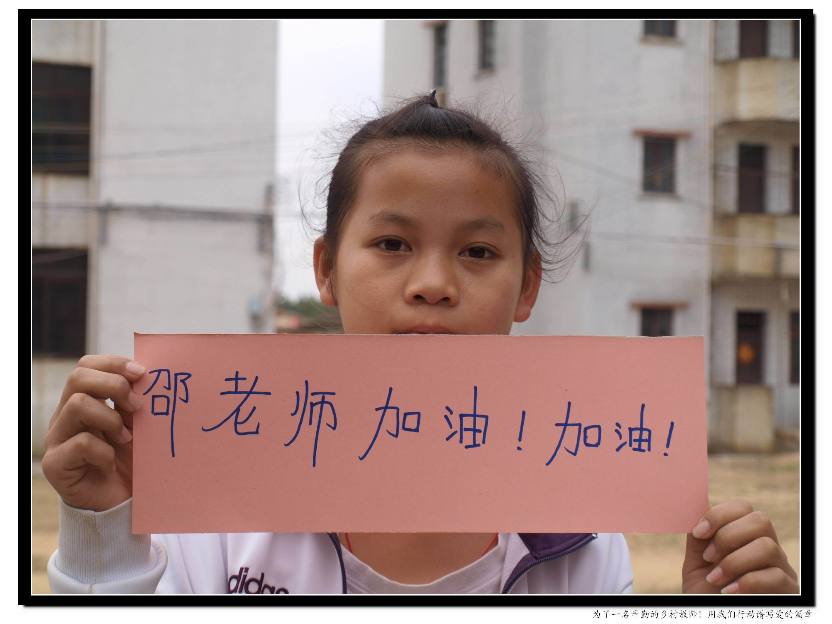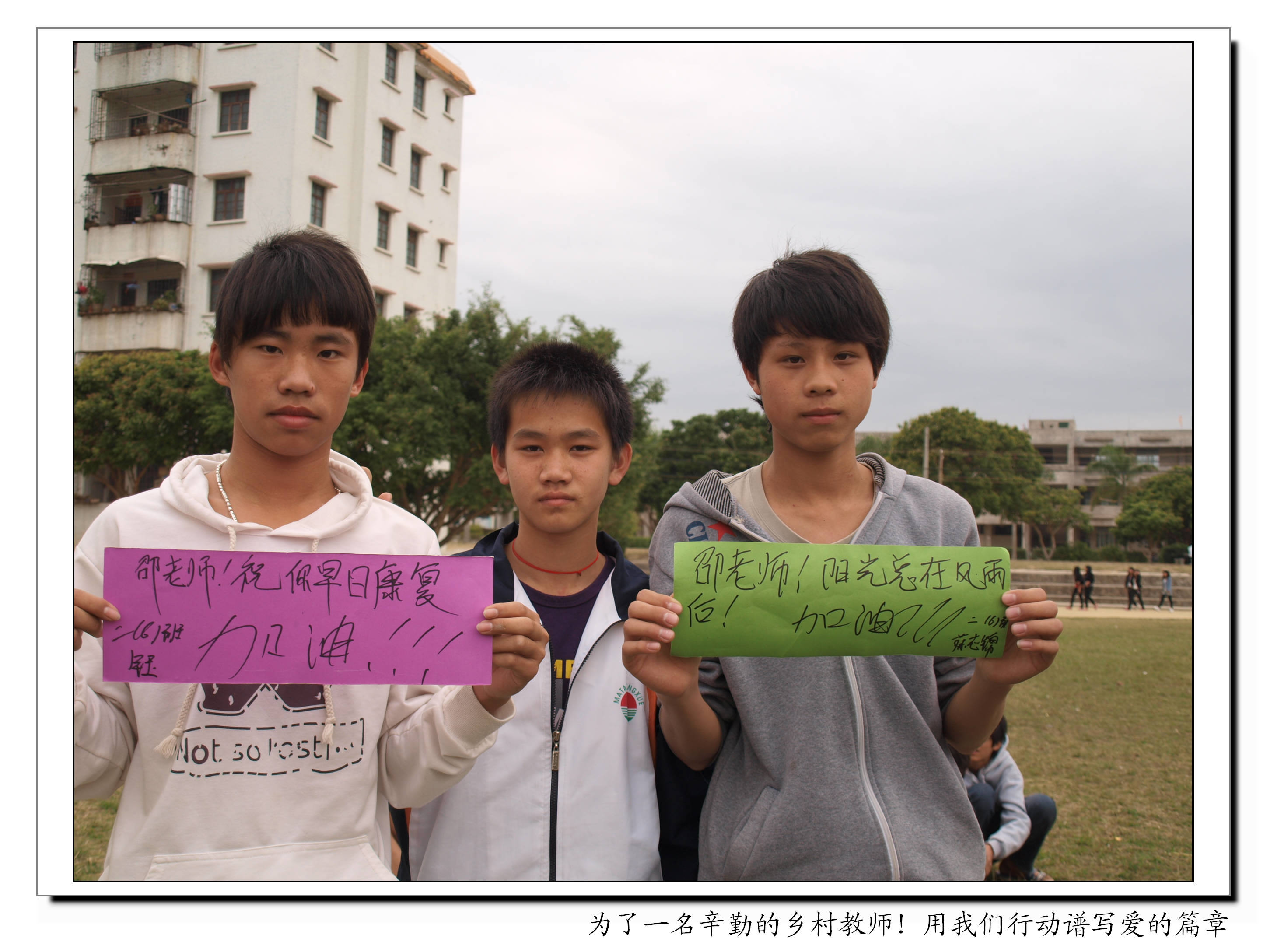 QUOTE(游侠918 @ 2011年03月06日 Sunday, 10:15 AM) 祝邵老师早日康复。好老师人助神佑。 图片上写的字好像同一人手笔,且那些学生表情有点…… [snapback]3108737[/snapback] 卡片上的字都是我写的,卡纸也是自己做的,由于当时有这个让学生拿着祝福语的拍照的想法,所以急着自己做了些,星期五那天自己就带着学生去拍了几张。要说明的是,祈福不是学生自发的,但看到老师这样做的时候,他们也非常踊跃。现在校长获悉了,准备下个星期让团委组织学生一起开展这项爱心活动,我相信不管这个活动形式如何,大家都是很支持的! 还有关于学生拍照的时候的表情,很多同事说跟楼上的一样!可是我觉得支持邵老师,为他打气我们就不要太悲,因为照片的祝福语都是送给邵老师一个人的,让他看到曾经在学校看到那些灿烂可爱的面孔,他会更坚强起来。当然,照片传到论坛上,网友们也会看到会做出各种猜想,不过我觉得孩子的真心的善意超乎了所有不必要的疑虑!