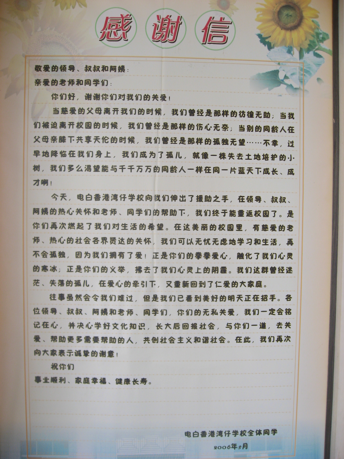 一位姓韩的女同学告诉记者,她父母双亡,只与年迈的爷爷相依为命,是党和政府将她送到这里读书,所有的学习及生活费用,都是政府扶持及社会热心人士资助的。象深圳电白同乡会就经常派人到学校看望和助学。她及同学们对此都非常感动,暗暗下定决心加倍努力,学好知识回报社会、回报热心人。