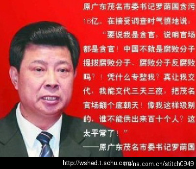 茂名市委书记罗荫国贪污16亿,在接受调查时称:“要说我是贪官,说明官场都是贪官。” “凭什么专整我?真让我交代,我能交代三天三夜,把茂名官场翻个底朝天。”“中国不就是腐败分子提拔腐败分子,腐败分子反腐败吗?” “像我这样级别的,谁不能供出来百十个人?这太平常了!”果然是真言,一语道出官场的腐败症结、官场的腐败根源。高,实在是高!