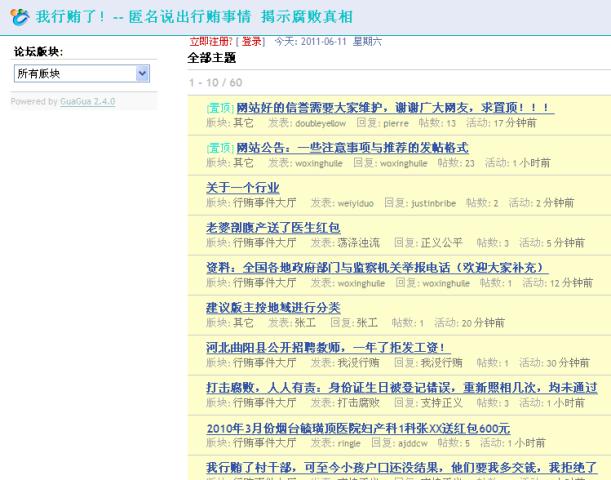 其中,第一家网站(www.ibribery.com/hl,以下简称“ibribery”),主页上方使用了包公和前总理朱F基的头像,并以黑体字打出了口号:“让贿赂无所遁形的网站还我和谐社会”;而第二家网站(www.woxinghuile.info,以下简称“woxinghui”)则相对简单,但同样有口号―――匿名说出你行贿事情,揭开腐败官员的真面目