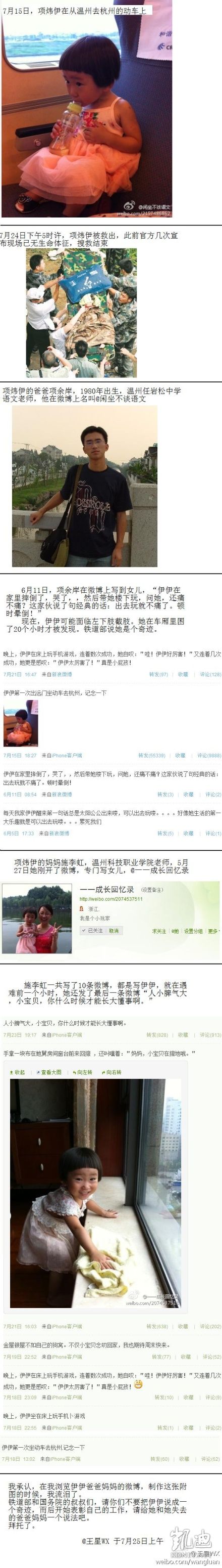 续航KEVIN:TMD! //@吕靖Emma:我哭了,真的心里太难受了。。。// @师师3730 :// @大宝妈淡定加油 :// @财经网 :【博客・余岸,你怎么连个死人都排不上】――余岸,7・23追尾事故最后一名获救者项炜伊的父亲。当日,余岸夫妇带着四岁的女儿项炜伊乘坐在D3115次动车上。事故使孩子同时失去了双亲。 @新华网浙江频道:@温州动车失事【余岸 你怎么连个死人都排不上?】昨天上午,就说是死亡35人了。昨天下午你们的尸体找到了,你们应该是死人了。可昨天晚上依然说是死亡35人。今天,现在当我敲击键盘的时候,依然死亡35人。兄弟,我可怜的兄弟,你怎么连个死人都排不上?伊伊父亲朋友的博文http://t.cn/al1eck 原文转发(15542)|原文评论(2524) 30秒前 来自iPhone客户端 转发 | 收藏 | 评论 唐殿良-Sugar老:妈妈,请再爱我一次:温州动车追尾事故最后一名获救者,年仅两岁零八个月的小女孩项炜伊,术后睁开了眼睛,她的父亲、母亲都不幸遇难。早上,一个护士抱着小伊,半睡中,误以为该护士是妈妈,第一次开口说:“妈妈,你去哪里了?我还以为你不要我了”……现场几乎所有人都哭了 40秒前 来自微博AIR 转发 | 收藏 | 评论 期货指南-论坛:妈妈,请再爱我一次:温州动车追尾事故最后一名获救者,年仅两岁零八个月的小女孩项炜伊,术后睁开了眼睛,她的父亲、母亲都不幸遇难。早上,一个护士抱着小伊,半睡中,误以为该护士是妈妈,第一次开口说:“妈妈,你去哪里了?我还以为你不要我了”……现场几乎所有人都哭了