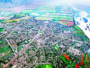 第一个城市新疆的伊犁,中国的八卦城。在新疆的伊犁河上游有一个这样的城市,叫特克斯,这个城市就是以八卦建成的,叫八卦城,以中心城市公园为基心,向周边辐射。有人说这个是不是新的、是伪造的?不是伪造的,可以负责任讲不是伪造的。它是哪一年建成的呢?是南宋时期,公元1230年,由我们道教的龙门教教主邱处机应当时的蒙古大汗成吉思汗的邀请来建立的。后来在700年后,在1992年,邱处机的后人也是一个风水大师,他又把这个城市进行了改建,就是现在这个面貌,噎成为中国研究城市走向风水的一个重要历史性的标志。这是特克斯。