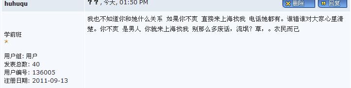 杀 杀虎使者 大学二年级 注册 2009-04-15 消息 776 反馈评分 1 点数 1 2011-09-15 #83 QUOTE(huhuqu @ 2011年09月15日 Thursday, 01:43 PM) 你不爽啊 那来上海啊 ,电话要不。。要不要我给你买机票?省得你游泳来上海; [snapback]3218125[/snapback] 附件 360截图20110915140824453.jpg 18.7 KB · 查看: 436