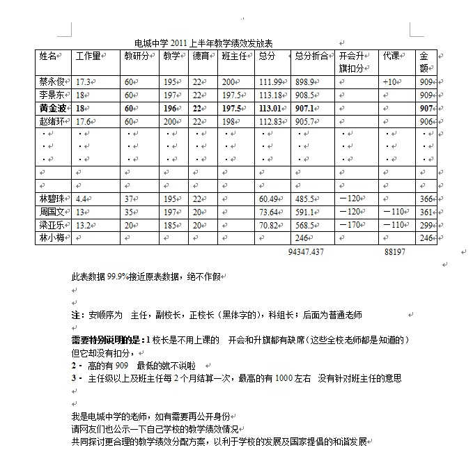 电城中学2011上半年教学绩效发放表公示