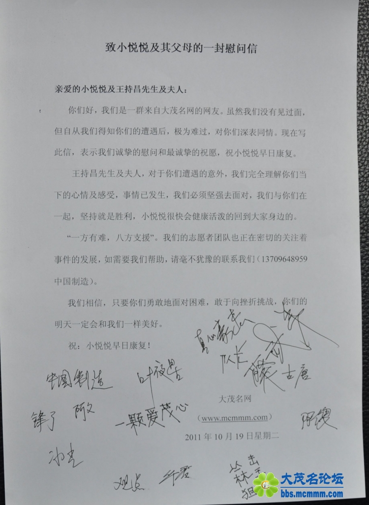 小悦悦的父亲出来接受了我们的慰问物品并让我们转达对大茂名网友的谢意,谢谢你们!考虑到连日来小悦悦父母对于过多的采访和外界的探访也感到了一定压力,同样我们也担心我们的到访会对其父亲造成一定的压力,所以我们并没有拍摄过多的照片,在此也特向一众关心小悦悦的爱心网友致歉!希望爱心网友们谅解!