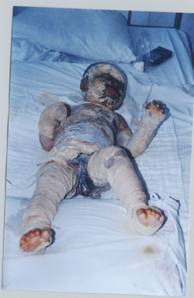 把这个从火海中救出的无辜。一路上,妈妈口不停地叫,天啊!车开得怎么那么慢呢?知道吗?一条可怜的生命在这里挣扎呢?好不容易捱到了电白县人民医院,可怕的是县人民医院的医生见到那可怕的情景已不敢接收,无奈又从县人民医院转到几十公里的茂名市人民医院,道路是那么的漫长,车到市人民医院时已是九点多钟,就在这漫长的三个多小时里面,可想而知梓滔承受着多大的痛苦和煎熬,想想成年人在火堆里好像火球乱滚,烧成好像火球一样,那是多么残忍的事,更何况是一个还未满2周岁的幼儿。天啊!全家人把梓滔抢送到急救室时,也已是伤遍体伤。那时,为了救梓滔,全家人亦被不同程度烧伤,烧伤是痛的,但是想起孩子在火海中滚而救出已是面目全非时,心更痛。