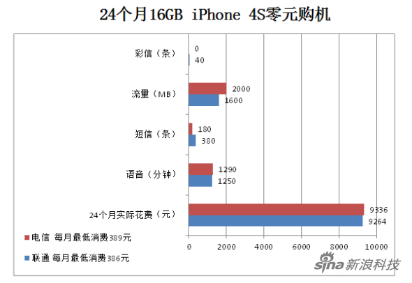 以16GB版本iPhone 4S为例,24个月合约计划中国电信版本的实际花费为9336元,中国联通版本的实际花费9264元。电信版比联通版每月多花3元,两年多花费72元。