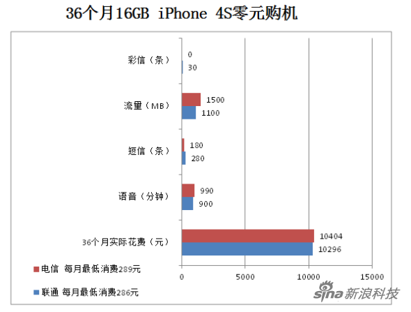 以32GB版本iPhone 4S为例,36个月合约计划中国电信版本的实际花费为10404元,中国联通版本的实际花费10296元。电信版比联通版每月多花3元,三年多花费108元。