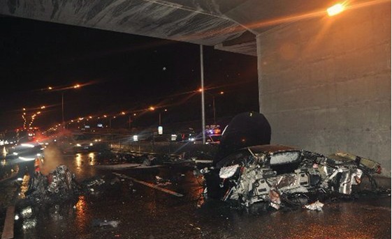 拉利跑车停在马路北侧,发动机则位于路中央,已经起火燃烧。120急救中心的医生确定这名男子当场死亡,