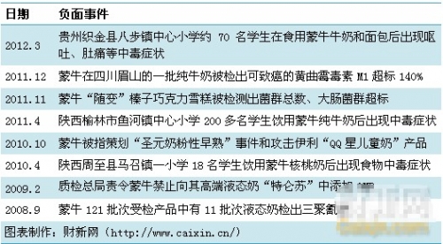 [attachmentid=292880]核心提示:近年来国内食品安全问题频发,一再刺激公众受伤的神经,而作为乳液龙头企业之一的蒙牛更是接连被曝光。从2008年被检测出液态奶含三聚氰胺事件,到被指策划“圣元奶粉致儿童性早熟事件”和攻击伊利“QQ星儿童奶”产品事件,到蒙牛“脏乱门”事件,再到2011年12月蒙牛乳业产品被检出黄曲霉毒素M1超标140% ……可谓伤透了大众脆弱的心灵。