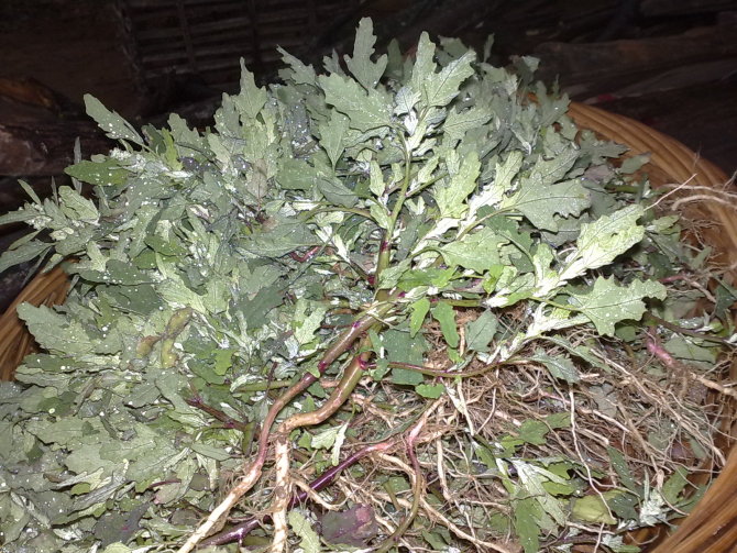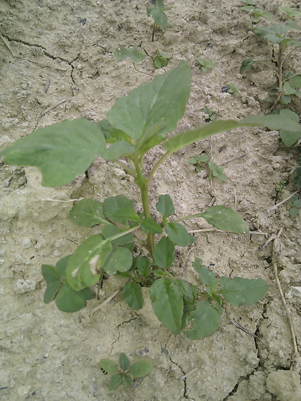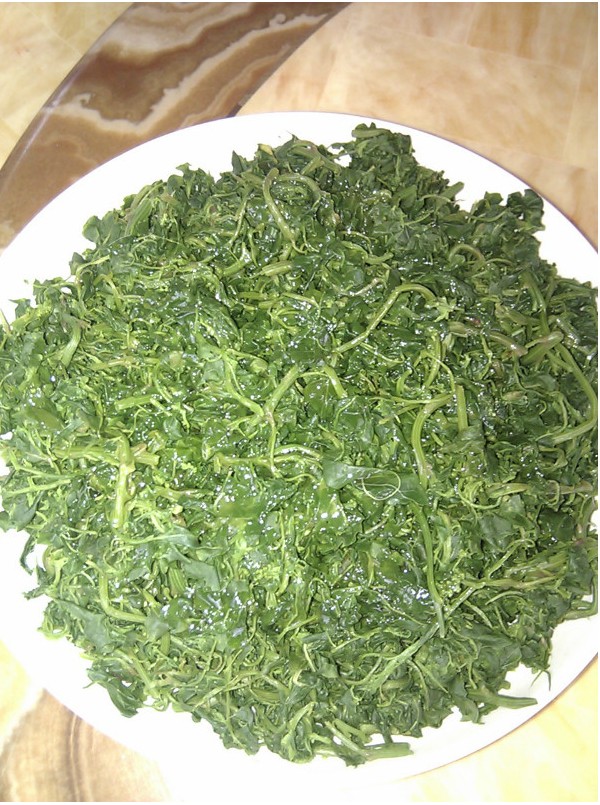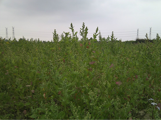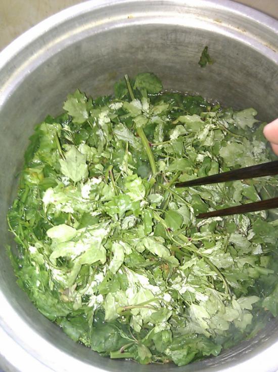 估计很多小时候在田里长大的人都有吃过这种野菜,到现在那个味道还是独特地让人回味无穷,所以决定再下一趟田,动手做一回吃一回。因为伸手去摘的时候手上会粘有许多绿白色如盐的粉末,所以顾名思义本地人都叫它作盐子菜,其他地方就不得而知了。虽说它是菜,但它又是田间一种长势比较疯狂的野草,春天一到就遍布得到处都是,特别喜欢在番薯和花生这类作物的地里搞破坏,下雨了便是茫茫一片农民看着它只能暗暗叫苦。小时候就经常吃到,就因为家里种的番薯和花生多,拔出来的盐子菜可以堆成山了,害我们累一天的东西我们当然是恨啊。于是洗干净锅,挑那些最嫩最好的做送粥的菜。呵呵,其实说是恨它才吃是开玩笑的,吃起来的时候那还记得什么恨,大口大口地浑然陶醉那种特别的味道――软软的,夹带着花生油和蒜子的味道,一股独特的清香在舌头上翻滚。