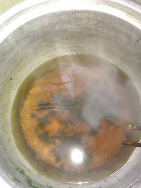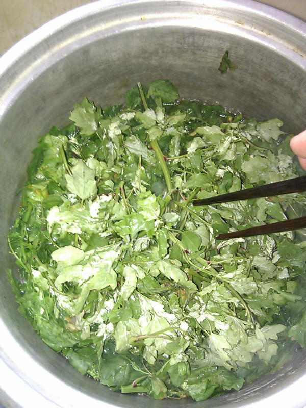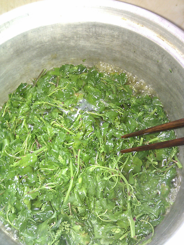 有些人说菜汁的维生素才多,不过看着黄黄的颜色,营养再好我也觉得没兴趣。下一步就要下盐了,虽叫盐子菜但却天然中不含丝毫咸味,所以味道一定要好好调。趁着热气和剩余的水分,是最好入味的时候,用筷子将盐好好搅匀。