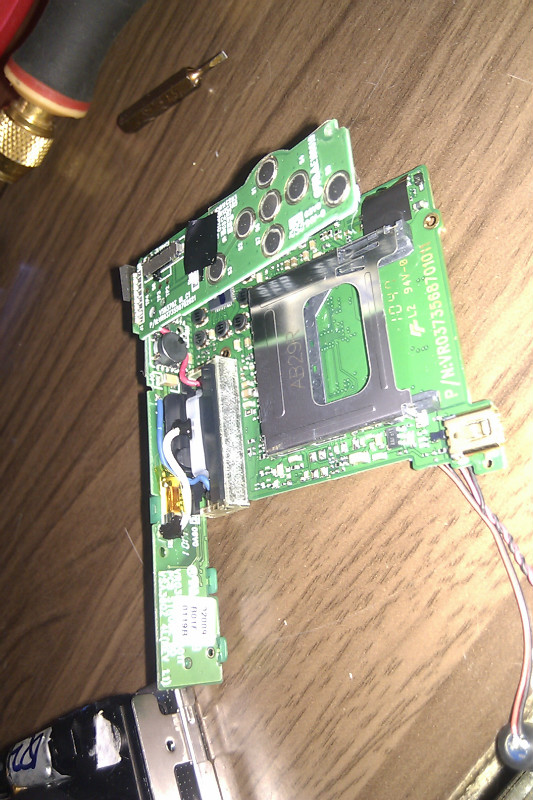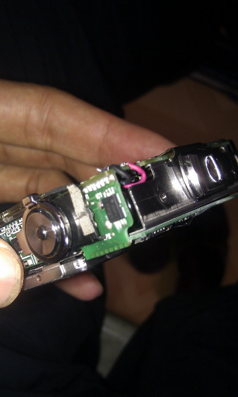 拆开两块外壳,不费多少力气,不过要分离主板和机体的框架就有点麻烦,螺丝很多,而且每拆一个都要看清楚,因为全部都拆掉的话,等一下全部散架了,就不知道如何来安装了,所以我还是小心为妙。所以决定先把主板拿下,但是弄了半天也搞不下来,主板总是卡住,而且这个机子的闪光灯模块和按键模块都是一起连接在主板上。国货就是国货,我还是藐视你呀!由于没给电容放电,我还得小心那个电容的接口(见图,快门按键旁边的那块黑色小板就是了),不然被电到一摔就全军覆没了。