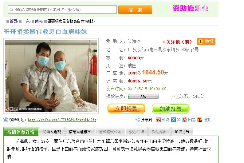 QUOTE(水东吴海波 @ 2012年06月25日 Monday, 10:10 PM) 很幸运和妹妹的骨髓配对成功,但接下来还需要约50万元的费用(2个化疗(10万),骨髓移植手术(30万),移植后加强治疗(10万)!我跪求大家在家庭经济允许的情况下,慷慨解囊,你们的每一份支持都在传递一份生命的热度,使海燕生命得到延续,让生命之花再度绽放! [attachmentid=296776] [snapback]3377585[/snapback] 恭喜! QUOTE(水区国际新闻发言人 @ 2012年06月26日 Tuesday, 09:39 AM) 祝福吴同乡医疗进展获得突破,并祈愿尽早康复! 水区国际集团将再次认捐1300元,由于目前集团管理层还在欧洲,将尽快通过其他渠道将捐款转交吴同乡。 [snapback]3377804[/snapback]