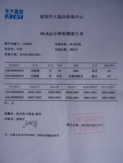 水 水东吴海波 小学二年级 注册 2012-05-04 消息 180 反馈评分 0 点数 0 2012-06-25 #183 很幸运和妹妹的骨髓配对成功,但接下来还需要约50万元的费用(2个化疗(10万),骨髓移植手术(30万),移植后加强治疗(10万)!我跪求大家在家庭经济允许的情况下,慷慨解囊,你们的每一份支持都在传递一份生命的热度,使海燕生命得到延续,让生命之花再度绽放! [attachmentid=296776] 附件 骨髓配对结果1.jpg 115.1 KB · 查看: 437