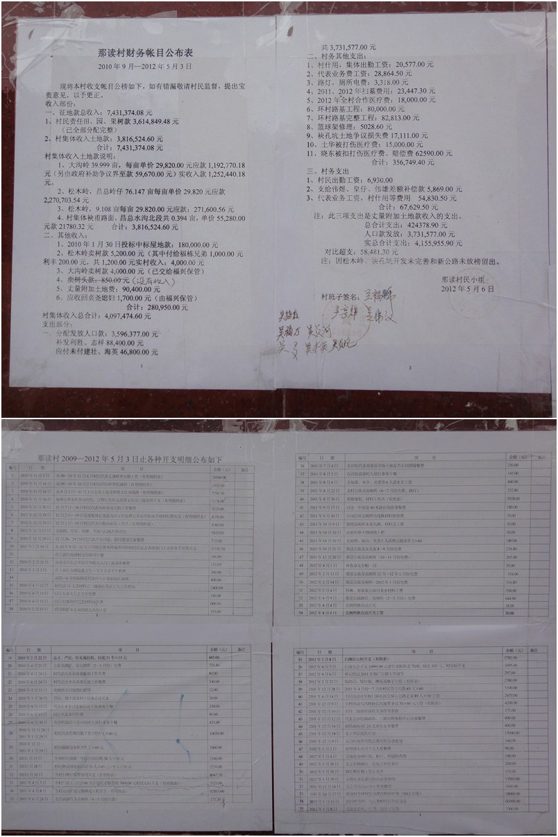 3、吴建壮2008年非法出任我们村村长至今,从来没有公开村财务状况,只是在2012年5月6日在村民的强烈抗议之下,才公布了2010年11月5日至今的财务收支情况,并且,公布的账目中有多个时段的账款收支情况不清,或没有记录,只有支出情况明细表,而没有收入情况明细表,吴建壮拒绝提供我们村民小组银行公帐的财务清单,有重大的做假账嫌疑。