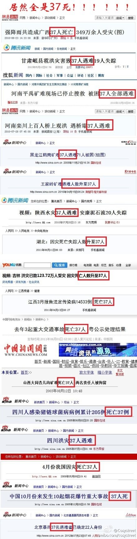 QUOTE(小白兔888 @ 2012年07月26日 Thursday, 08:18 PM) 不是说37人死亡吗?我们要统一口径说37人。否则,你懂的!! [snapback]3394903[/snapback]